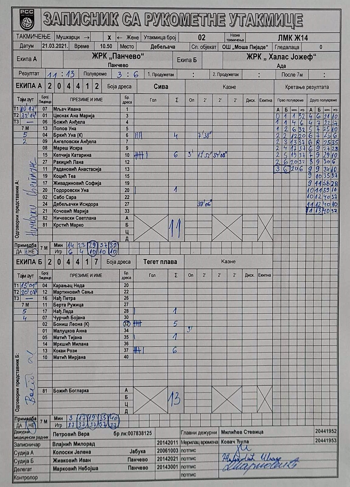 | Igrač | gol | 2` | dk | MVP |