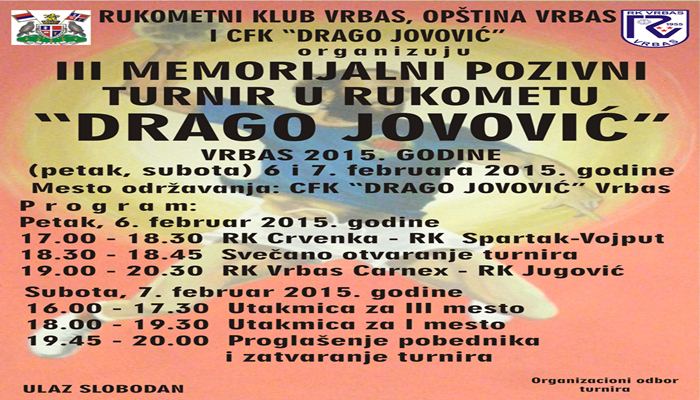 Општина Врбас, Међуопштински рукометни савез "Врбас", Савез спортова општине "Врбас" и Рукометни клуб "Врбас" организују трећи меморијални турнир "Драго [...]