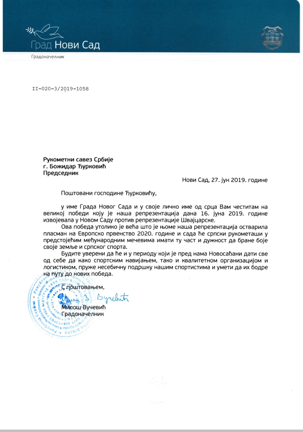 На адресу Рукометног савеза Србије стигла је честитка и подршка градночелника Новог Сада, господина Милоша Вучевића