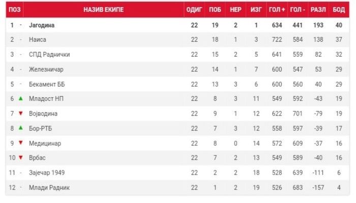 Након 22 одиграна кола у плеј-оф су се пласирале екипе ЖОРК Јагодина која заузима прво место на табели са 40 освојених бодова, ЖРК Наиса је друга са 37, СПД Раднички заузима треће место са 32 бода и ЖРК Бекамент ББ са 29 освојених бодова.