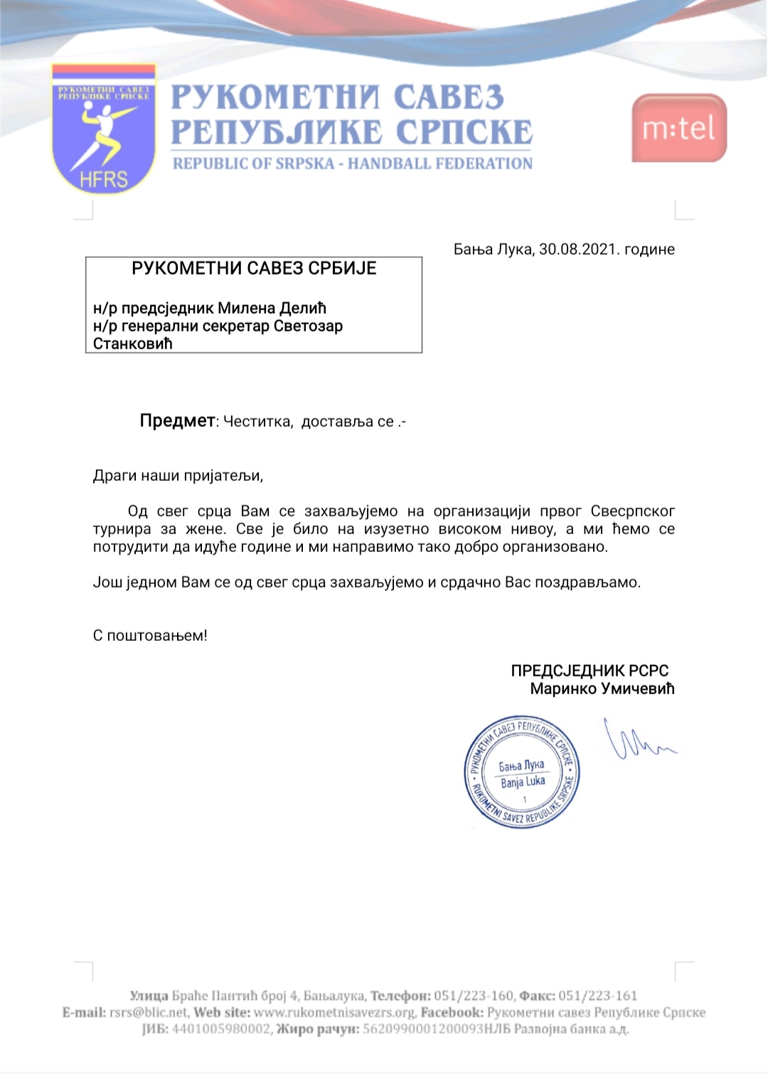 Честитка Рукометног савеза Републике Српске и ЖРК Борац Бања Лука за организацију Свесрпског купа 2021