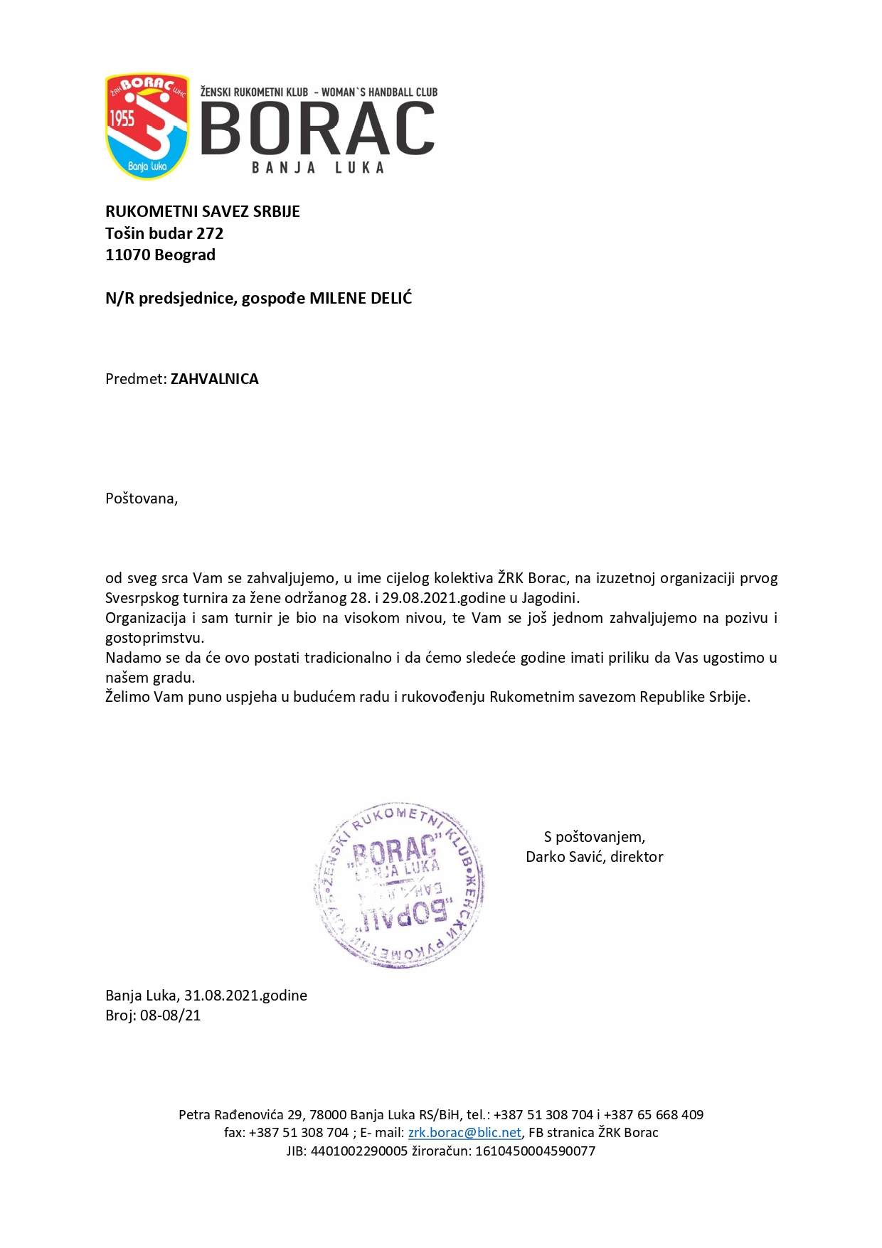 од свег срца Вам се захваљујемо, у име целог колектива ЖРК Борац, на изузетној организацији првог Свесрпског турнира за жене одржаног 28. и 29.08.2021. године у Јагодини.