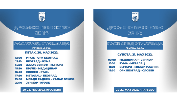 Државно првенство Ж14 на програму је од 20. до 22. маја 2022. године у Спортском центру Ибар у Краљеву.