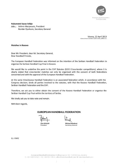 Због наведеног, молимо вас да или добијете сагласност Рукометне Федерације Косова, или да финале купа Србије организујете у оквиру територије Србије.