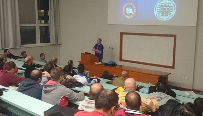 У наставку реализације Пројекта, на задовољство тренера, декан Факултета ,Проф.др Владимир Копривица (на слици),у склопу предмета Теорија спортског тренинга,је одржао ванредно предавање на тему Спортска форма.Питање спортске форме је мозда и од највећег значаја у раду са спортистима јер предтсваља сублимацију знања из свих осталих области.Присутни тренери су имали прилику да од предавача сазнају теоретске основе везане за ову проблематику а и да чују доста практичних савета из пребогатог искуства једног од највећих стручњака из ове бласти ван граница Србије.