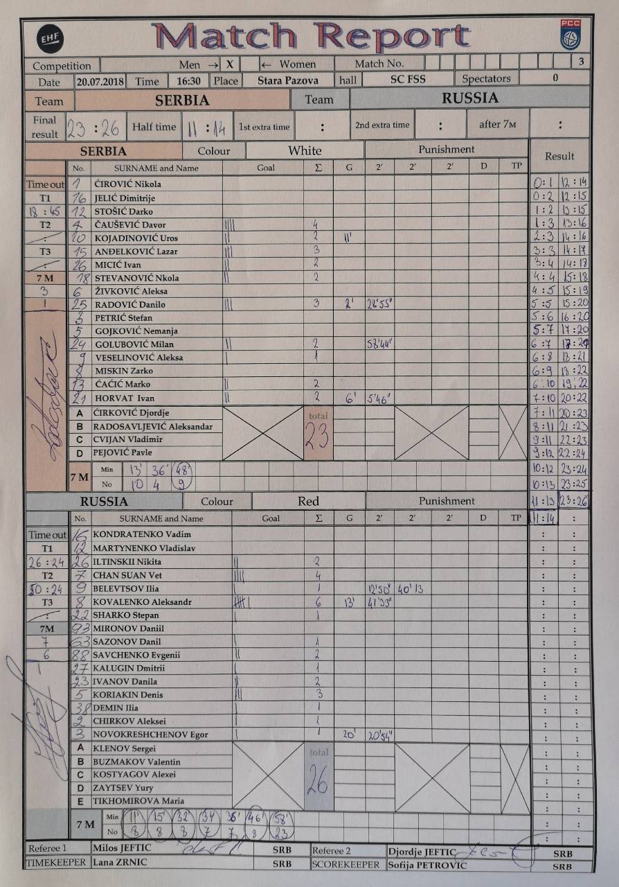 20.07. 2018 Кадети поражени од Руса Кадетска репрезентација Србије поражена је од Русије 23:26 у трећем пријатељском мечу одиграном у Старој Пазови.