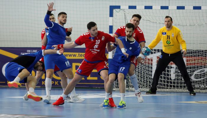 Добро су отворили дуел повратник у српски тим после више од три године Петар Ненадић и Мијајло Марсенић на позицији пивотмена уводним головима. Грци су се, међутим, показали као тврд орах. Имали су српски рукометаши проблема у одбрани са средњим беком грчког састава Маљоса који је уз помоћ пар одбрана расположеног Буковинаса, вратио свој тим из почетног минуса (2:4) до 6:4 у 11.минуту. Седам минута касније Ненадић је поново вратио „орлове“ у вођство 9:8, да би до полувремена Грци ипак повратили контролу над резултатом – 14:12.
