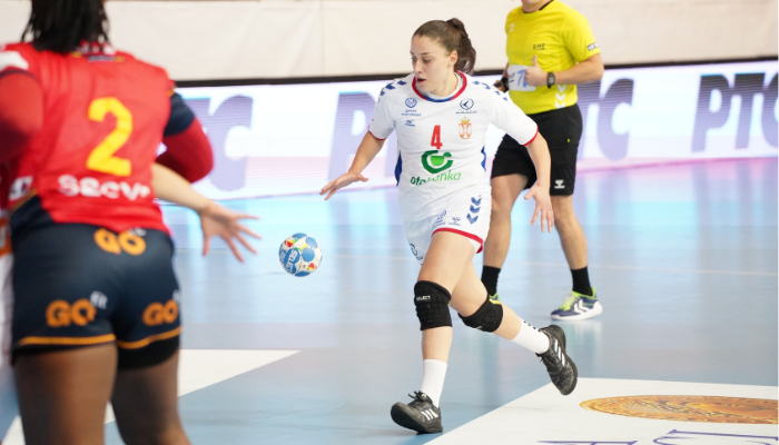 Ушле су изабранице Љиљане Марковић у меч са другачијом енергијом у односу на јучерашњи дуел са Италијом и на старту се чинило да ћемо видети другачије лице Србије, али и резултат. Све до 20. минута првог полувремена, игале су егал српске рукометашице. Васић је отворила са два гола у мрежи Шпаније, а потом су се у листу стрелаца уписивале и Митровић, Мандић, Булатовић, Мариновић и Тодоровски. Стајало је на семафору 9:9 а потом су уследила четири везана гола Шпаније. Озбиљне је муке задавала одбрани Србије играчица Шпаније са бројем 17, Естер Сомаза Бош, која је до одласка на паузу пет пута затресла мрежу српског националног тима.