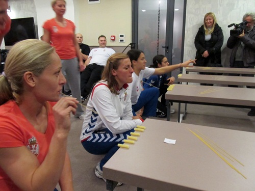 Среда вече, била је резервисана за нешто што се тешко адекватно може превести на српски језик, а познато је под називом “тим билдинг”. Било како било, два сата проведена у семинар-сали хотела “Соларис”, изазвала су салве смеха и позитивне енергије код играчица, стручног штаба и људи окупљених око државног тима. Играчице су осмислиле 15 игара, у којима су спретност, брзина и духовитост долазиле до изражаја. Четири екипе, бориле су се лавовски, скоро као на терену, за титулу најбоље: